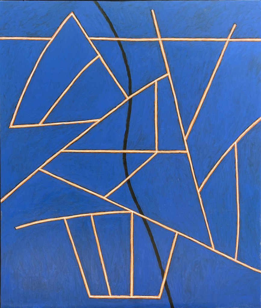 Like star maps of a night sky, this obvious association readily gives way to more layered and complex possibilities. Thornton employs a limited vocabulary of fundamentals – three colors, flat surfaces, little or no illusionary space – to create an emormous range of evocative canvases. Their linear configurations can appear ambiguous, but when seen in series they also refer to earlier compositions reduced to their essential elements. A careful inspection reveals the artist’s ongoing concern for the “icon image as presence,” the childlike playfulness with basic geometric forms, and an intuitive use of diminishment that zeroes in on the “thing-ness” of his subject.